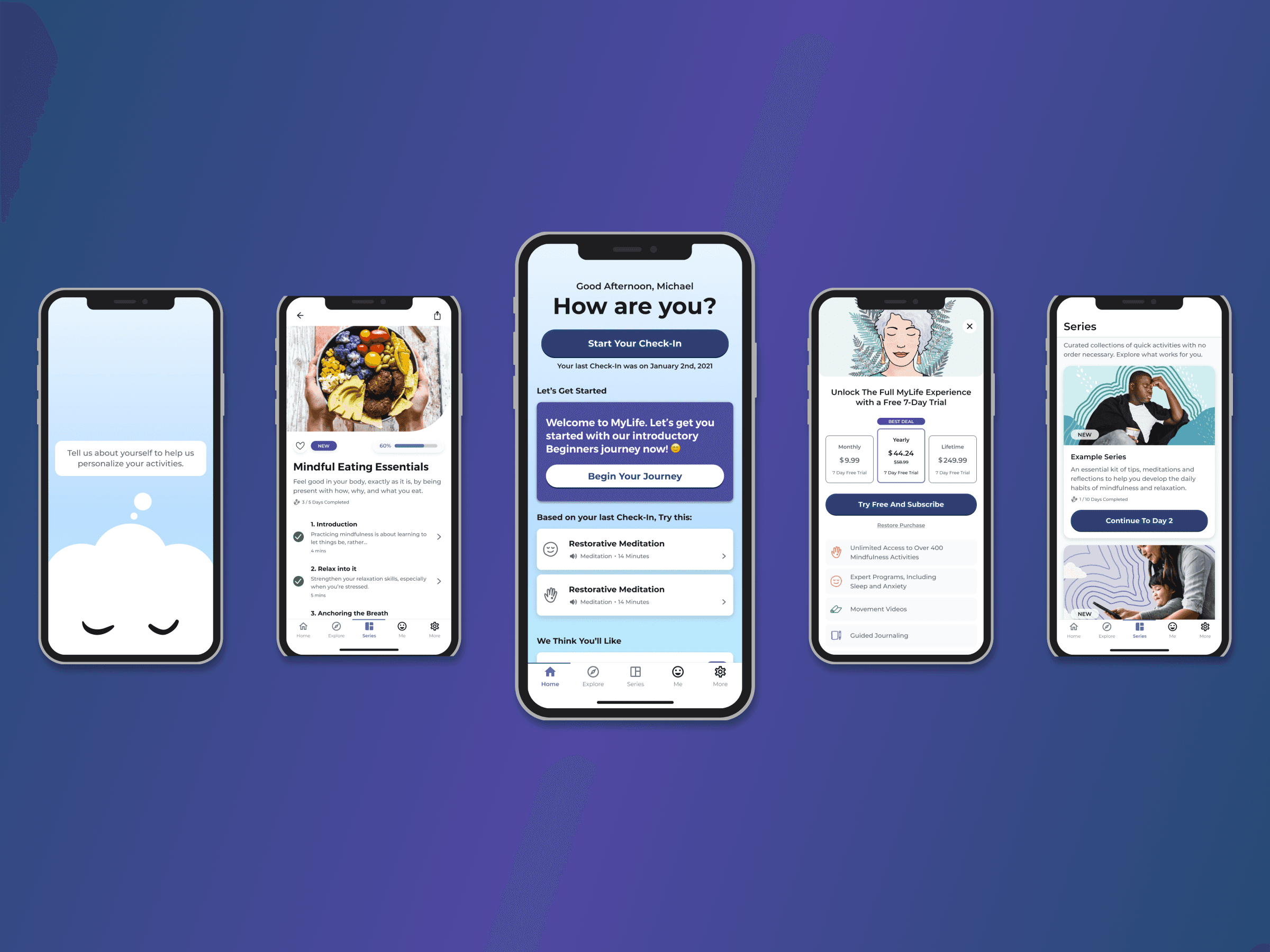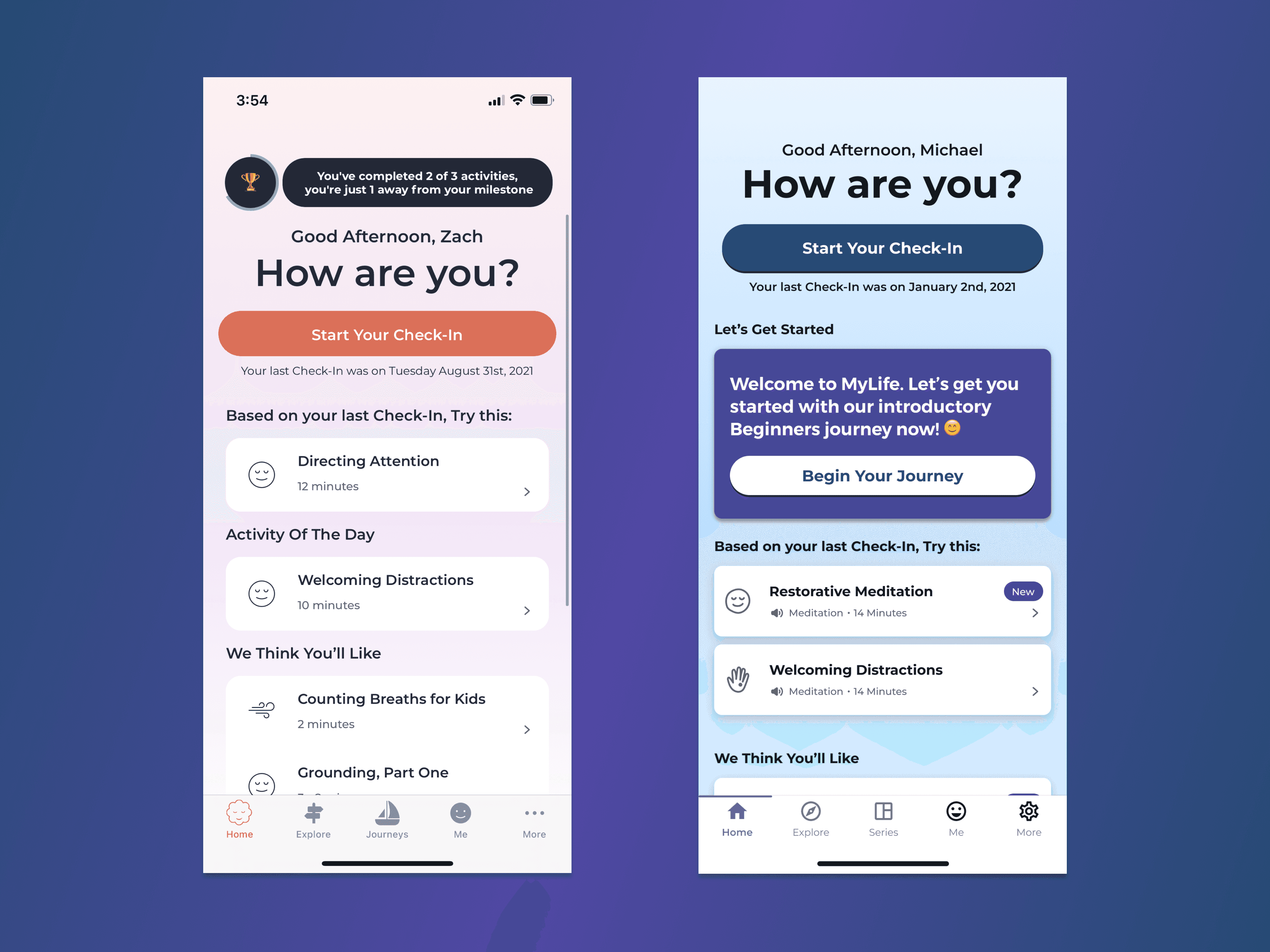 MyLife offered mindfulness and meditation practices, including daily check-ins and long-term series for improved mental health.