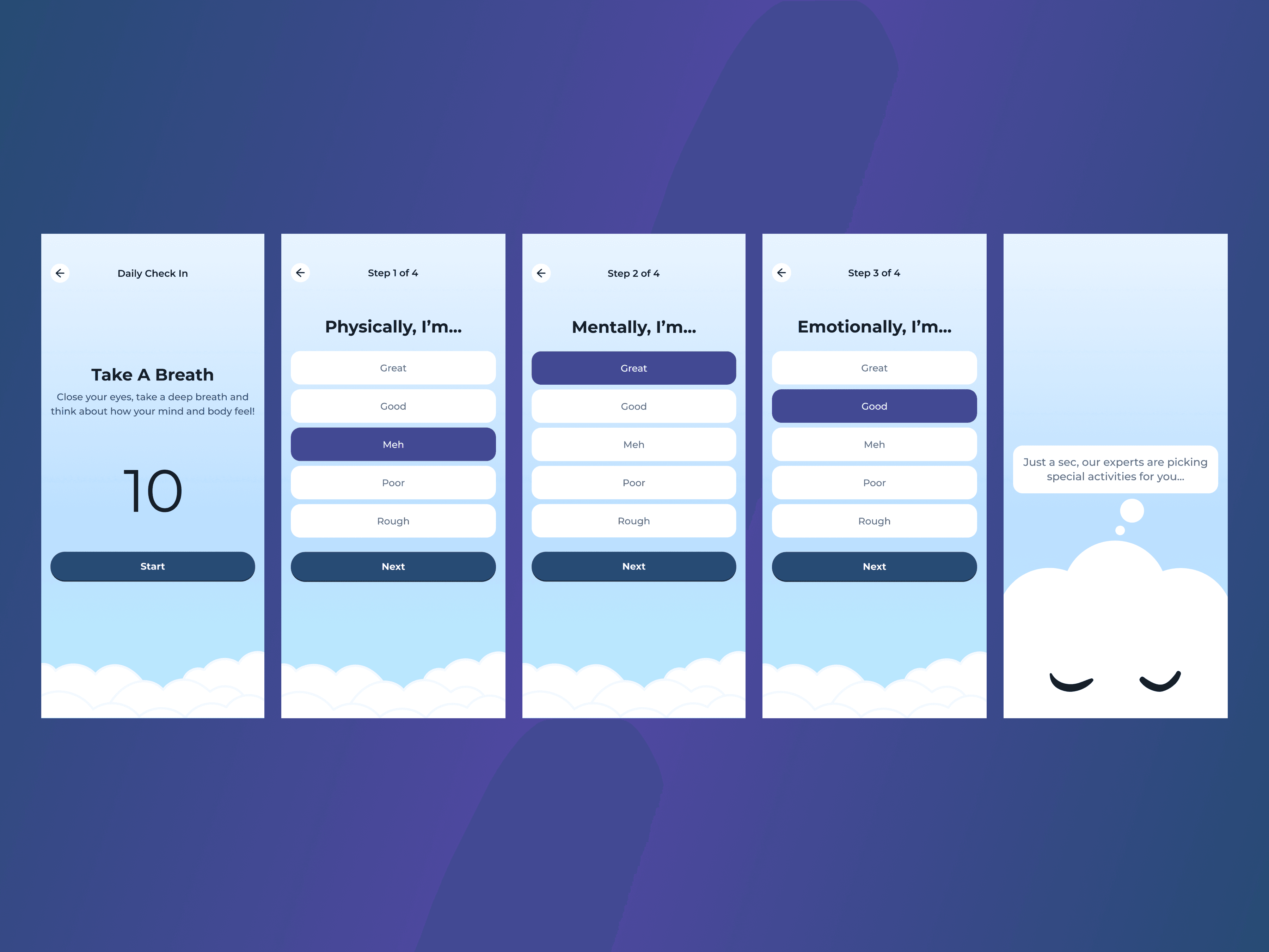 The daily check-in led users through a quick meditation and mindfulness check, before generating a list of suitable activities.